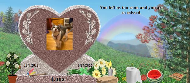 Dear Luna, how purrfectly beautiful you are! Please go to the Bridge and purr your precious love down the Rainbow straight into the heart of your mommy who misses you so much, and she will send her love right back to you on angels' wings. Dear Maria, your world has lost a very special furpurrson, family member and friend, and heaven has welcomed Home a very special soul. Luna is now your very own angel, watching over and for you, just as Jackie, Callie, Tashi, Katy and BG are watching over us, until you meet again and cross the Bridge together. May her sweet presence continually nuzzle your heart until then, and may you find comfort in knowing that the silver thread of love that binds you heart to heart with Luna will never be broken. Many blessings and much peace, Clare and Martha...Please visit our Jackie at https://www.rainbowsbridge.com/residents/JACKI010/resident.HTM