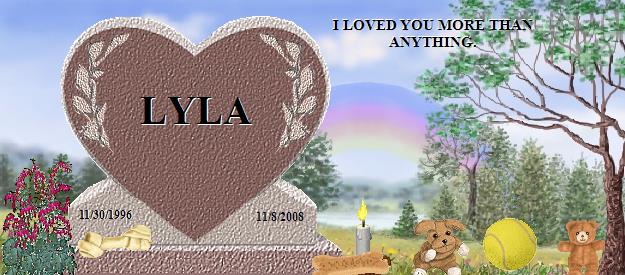 Lyla, What a precious baby you were, always so loyal and loving. You taught and gave your mommy so much that she now knows the true meaning of unconditional love. She longs for the day to be able to hold you and to look into your eyes again. I know just how grateful you are for all of love and care in which she provided you. She misses you baby, so very much. I know that you don't want her to be sad for too long, but instead, be happy. For you are happy, content at peace and have been surrounded by so many others who also love and adore you, including my Shayna Girl and Leche. I extend my deepest condolences to you for the loss of Lyla. I know just how painful it is to have lost your angel, for, I too, lost mine. Please vist my Shayna Girl at: http://rainbowsbridge.com/residents/SHAYN005/Resident.htm and Leche at http://www.rainbowbridge.com/residents/LECHE001/Resident.htm My thoughts and prayers are with you. Until we are with our babies again. Shayna and Leche's mommy, Lisa