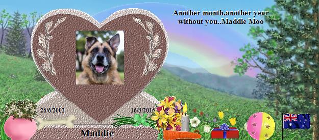 I am so sorry to hear about your loss of Maddie. Please find comfort in knowing that Maddie is now at Rainbows Bridge and making lots of friends. Saying goodbye is never easy. I also lost my precious cat Spooky July 30th 2001 after 16 wonderful years with her. On January 11, 2013, I lost my faithful friend Hannah who was a beautiful blue tick hound dog. On August 2, 2013 another one of my beautiful cats, Sammi, a black and white tabby, went to Rainbows Bridge. April 9, 2014, Maci, my English Bulldog passed over to Rainbows Bridge. Maci and Hannah were best friends. I am sure that Maddie and my babies have all become good friends. You can visit with Spooky at: http://www.rainbowsbridge.com/residents/Spook002/resident.HTM Take Care, Susan