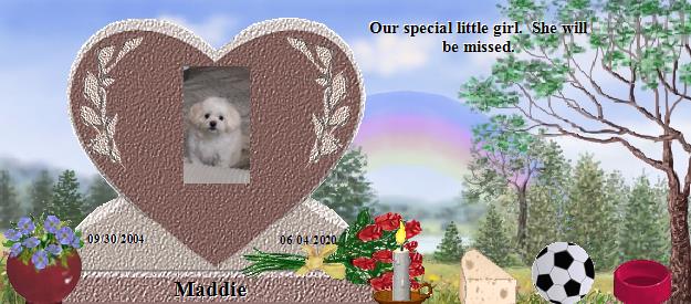 I am so sorry to hear about your loss of Maddie. Please find comfort in knowing that Maddie is now at Rainbows Bridge and making lots of friends. Saying goodbye is never easy. I also lost my precious cat Spooky July 30th 2001 after 16 wonderful years with her. I have lost several babies since Spooky's passing. Hannah 1/11/13, Sammi 8/2/13,Maci 4/9/14, Gabbi 3/20/17, Zoe 1/3/18, Willow 6/4/18, Shelby 6/12/18, Bear 11/17/19 and Bella and Murphy who were both tragically poisoned on 06/18/20. I am sure that Maddie and my babies have all become good friends. You can visit with Spooky at: http://www.rainbowsbridge.com/residents/Spook002/resident.HTM Take Care, Susan