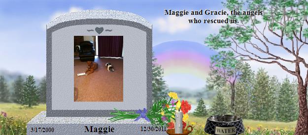 Maggie - Your dad, Jeffrey, just described the beautiful, perfect and simple hearts that God gives our fur children. Only evil man change can mess up what our Lord has done. Maggie, you are a precious lady and so beautiful! You have left your family many endearing memories! Send your family some signs, kisses from the Rainbow to let them know that you are safe, happy, healthy and will have many friends. Let Jeffrey know that God has appointed you to be his guardian, protector to watch over him until he is called to join you at the Bridge. To Jeffrey - I send my heartfelt sympathy to you over the loss of Maggie. I too lost my soulmate not long ago, see Brande at http://rainbowsbridge.com/residents/BRAND167/Resident.htm - We know that God has promised we will be with our babies again. I leave this quote with you, "heaven is the only place where all the dogs and cats you have ever loved will come running to meet you." Author Unknown