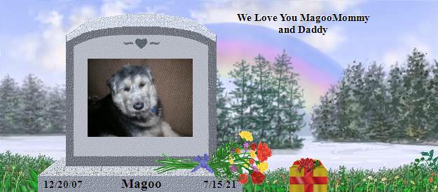 Dear Magoo, you are truly gorgeous. Please go to the Bridge and send your precious love down the Rainbow straight into the hearts of your mommy and daddy who miss you so much, and they will send their love right back to you on angels' wings. Dear Dale and Brenda, your world has lost a very special furperson, family member and friend, and heaven has welcomed Home a very special soul. Magoo is now your very own angel, watching over and for you, just as Jackie, Callie, Tashi, Katy and BG are watching over us, until you meet again and cross the Bridge together. May his sweet presence continually nuzzle your hearts until then, and may you find comfort in knowing that the silver thread of love that binds you heart to heart with Magoo will never be broken. Many blessings and much peace, Clare and Martha...Please visit our Jackie at https://www.rainbowsbridge.com/residents/JACKI010/resident.HTM