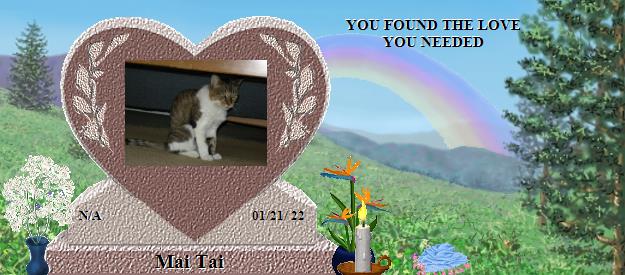 Dear Mai Tai, how purrfectly beautiful you are! Please go to the Bridge and send your precious love down the Rainbow straight into the heart of your mommy who misses you so much, and she will send her love right back to you on angels' wings. Dear Diane, your world has lost a very special furpurrson, family member and friend, and heaven has welcomed Home a very special soul. Mai Tai, along with Arlen, is now your very own angel, watching over and for you, just as Jackie, Callie, Tashi, Katy and BG are watching over us, until you meet again and cross the Bridge together. May Mai Tai's sweet presence continually nuzzle your heart until then, and may you find comfort in knowing that the silver thread of love that binds you heart to heart with Mai Tai and Arlen will never be broken. Many blessings and much peace, Clare and Martha...Please visit our Jackie at https://www.rainbowsbridge.com/residents/JACKI010/resident.HTM