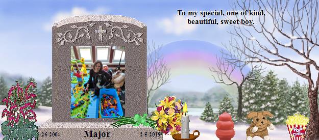 Dear Major, you are truly handsome. Please go to the Bridge and send your precious love down the Rainbow straight into the hearts of your mom and dad who miss you so much, and they will send their love right back to you on angels' wings. Dear Diana and Nick, your world has lost a very special furperson, family member and friend, and heaven has welcomed Home a very special soul. Major is now your very own angel, watching over and for you, just as Tashi, Katy and BG are watching over us, until you meet again and cross the Bridge together. May his sweet presence continually nuzzle your hearts until then, and may you find comfort in knowing that the silver thread of love that binds you heart to heart with Major will never be broken. Many blessings and much peace, Clare and Martha...Please visit our Tashi at http://www.rainbowsbridge.com/residents/TASHI002/resident.HTM