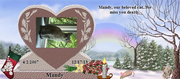 Janet, my deepest condolences on the loss of your beloved Mandy. What you wrote about her honors her and your love for her. I am reminded of my sweet dog, Chili, who was sick for years and went through a lot, just as your precious girl did. My love and bond with Chili was truly one of the greatest gifts I have ever received from God. I can see you had a similar loving bond with your beautiful Mandy. It is so very hard when our fur children pass. They are a part of us and the hole they leave behind when they've gone to The Bridge is huge. My Chili went to The Bridge late April. I think of her everyday, as I know you think and cry for your sweet baby. Please know that I am thinking of you during this sad time. Sincerely, Lauren If you’d like to visit Chili’s memorial, please go to: http://RainbowsBridge.com/residents/CHILI001/Resident.htm