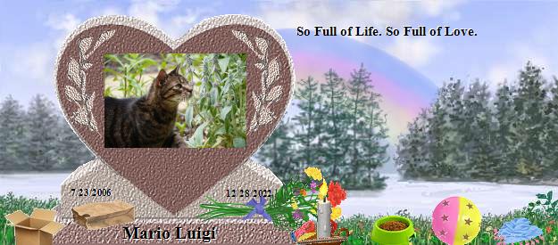 Dear Mario, how purrfectly handsome you are! Please go to the Bridge and purr your precious love down the Rainbow straight into the heart of your mom who misses you so much, and she will send her love right back to you on angels' wings. Dear Gigi, your world has lost a very special furpurrson, family member and friend, and heaven has welcomed Home a very special soul. Mario is now your very own angel, watching over and for you, just as Jackie, Callie, Tashi, Katy and BG are watching over us, until you meet again and cross the Bridge together. May his sweet presence continually nuzzle your heart until then, and may you find comfort in knowing that the silver thread of love that binds you heart to heart with Mario will never be broken. Many blessings and much peace, Clare and Martha...Please visit our Jackie at https://www.rainbowsbridge.com/residents/JACKI010/resident.HTM