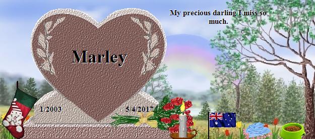 I am so sorry to hear about your loss of Marley. Please find comfort in knowing that Marley is now at Rainbows Bridge and making lots of friends. Saying goodbye is never easy. I also lost my precious cat Spooky July 30th 2001 after 16 wonderful years with her. On January 11, 2013, I lost my faithful friend Hannah who was a beautiful blue tick hound dog. On August 2, 2013 another one of my beautiful cats, Sammi, a black and white tabby, went to Rainbows Bridge. April 9, 2014, Maci, my English Bulldog passed over to Rainbows Bridge. Maci and Hannah were best friends. On March 20, 2017 my sweet little calico Gabbi crossed over Rainbow's Bridge. I adopted her about a month after Spooky passed away and Gabbi also lived to be almost 16 years old. I am sure that Marley and my babies have all become good friends. You can visit with Spooky at: http://www.rainbowsbridge.com/residents/Spook002/resident.HTM Take Care, Susan