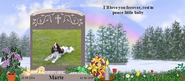Marte, What a precious baby you were, always so loyal and loving. You taught and gave your daddy so much that he now knows the true meaning of unconditional love. He longs for the day to be able to hold you and to look into your eyes again. I know just how grateful you are for all of love and care in which he provided you. He misses you baby, so very much. I know that you don't want him to be sad for too long, but instead, be happy. For you are happy, content at peace and have been surrounded by so many others who also love and adore you, including my Shayna Girl and Leche. I extend my deepest condolences to you for the loss of Marte.I know just how painful it is to have lost your angel, for, I too, lost mine. Please vist my Shayna Girl at: http://rainbowsbridge.com/residents/SHAYN005/Resident.htm and Leche at http://www.rainbowbridge.com/residents/LECHE001/Resident.htm My thoughts and prayers are with you. Until we are with our babies again. Shayna and Leche's mommy, Lisa