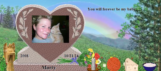 I am so sorry to hear about your loss of Marty. Please find comfort in knowing that Marty is now at Rainbows Bridge and making lots of friends. Saying goodbye is never easy. I also lost my precious cat Spooky July 30th, 2001, after 16 wonderful years with her. I have lost several babies since Spooky's passing. Hannah 1/11/13, Sammi 8/2/13, Maci 4/9/14, Gabbi 3/20/17, Zoe 1/3/18, Willow 6/4/18, Shelby 6/12/18, Bear 11/17/19, Bella and Murphy who were both tragically poisoned on 06/18/20, Firefly 12/20/22, Zachary 02/19/23, Tanner 02/22/24 and Tiger 08/01/24. I am sure that Marty and my babies have all become good friends. You can visit with Spooky at: http://www.rainbowsbridge.com/residents/Spook002/resident.HTM Take Care, Susan