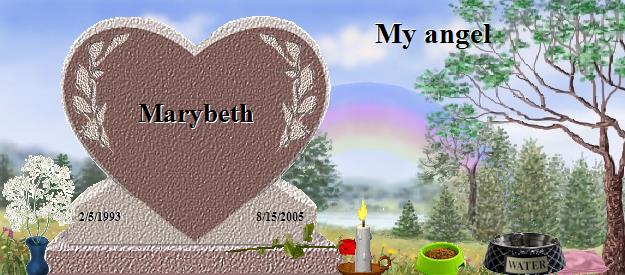 Dear Marybeth, you are truly cherished. Please go to the Bridge and send your precious love down the Rainbow straight into the heart of your mom who misses you so much, and she will send her love right back to you on angels' wings. Dear Judith, your world has lost a very special furperson, family member and friend and heaven has welcomed Home a very special soul. Marybeth is now your very own angel, watching over and for you, just as Tashi, Katy and BG are watching over us, until you meet again and cross the Bridge together. May her sweet presence continually nuzzle your heart until then, and may you find comfort in knowing that the silver thread of love that binds you heart to heart with Marybeth will never be broken. Many blessings and much peace, Clare and Martha...Please visit our Tashi at http://www.rainbowsbridge.com/residents/TASHI002/resident.HTM
