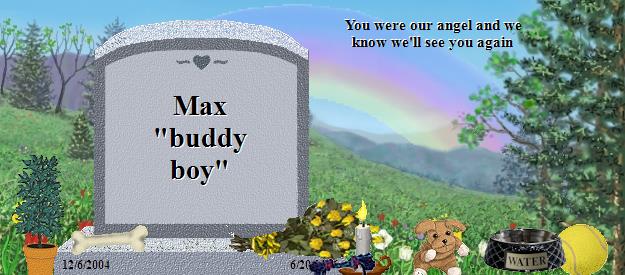 Dear Max "buddy boy", you are truly cherished. Please go to the Bridge and send your precious love down the Rainbow straight into the hearts of your family who miss you so much, and they will send their love right back to you on angels' wings. Dear Allison and Jenna, your world has lost a very special furperson, family member and friend, and heaven has welcomed Home a very special soul. Max is now your very own angel, watching over and for you, just as Tashi, Katy and BG are watching over us, until you meet again and cross the Bridge together. May his sweet love continually nuzzle your hearts until then, and may you find comfort in knowing that the silver thread of love that binds you heart to heart with Max will never be broken. Many blessings and much peace, Clare and Martha...Please visit our Tashi at http://www.rainbowsbridge.com/residents/TASHI002/resident.HTM