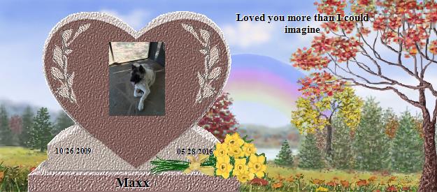 Dear Maxx, you are truly handsome. Please go to the Bridge and send your precious love down the Rainbow straight into the heart of your mom who misses you so much, and she will send her love right back to you on angels' wings. Dear Julie, your world has lost a very special furperson, family member and friend, and heaven has welcomed Home a very special soul. Maxx is now your very own angel, watching over and for you, just as Tashi, Katy and BG are watching over us, until you meet again and cross the Bridge together. May his sweet love continually nuzzle your heart until then, and may you find comfort in knowing that the silver thread of love that binds you heart to heart with Maxx will never be broken. Many blessings and much peace, Clare and Martha...Please visit our Tashi at http://www.rainbowsbridge.com/residents/TASHI002/resident.HTM