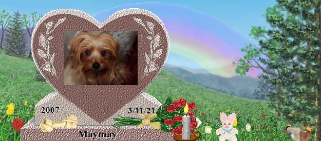 Dear Maymay, you are truly beautiful. Please go to the Bridge and send your precious love down the Rainbow straight into the heart of your momma who misses you so much, and she will send her love right back to you on angels' wings. Dear Kim, your world has lost a very special furperson, family member and friend, and heaven has welcomed Home a very special soul. Maymay, along with your other beloveds, is now your very own angel, watching over and for you, just as Jackie, Callie, Tashi, Katy and BG are watching over us, until you meet again and cross the Bridge together. May their sweet presence continually nuzzle your heart until then, and may you find comfort in knowing that the silver thread of love that binds you heart to heart with Maymay and the others will never be broken. Many blessings and much peace, Clare and Martha...Please visit our Jackie at https://www.rainbowsbridge.com/residents/JACKI010/resident.HTM