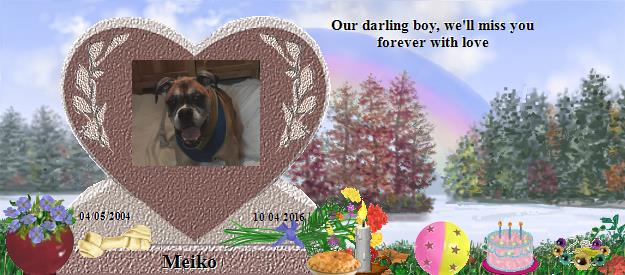 I am so sorry to hear about your loss of Meiko. Please find comfort in knowing that Meiko is now at Rainbows Bridge and making lots of friends. Saying goodbye is never easy. I also lost my precious cat Spooky July 30th 2001 after 16 wonderful years with her. On January 11, 2013, I lost my faithful friend Hannah who was a beautiful blue tick hound dog. On August 2, 2013 another one of my beautiful cats, Sammi, a black and white tabby, went to Rainbows Bridge. April 9, 2014, Maci, my English Bulldog passed over to Rainbows Bridge. Maci and Hannah were best friends. I am sure that Meiko and my babies have all become good friends. You can visit with Spooky at: http://www.rainbowsbridge.com/residents/Spook002/resident.HTM Take Care, Susan