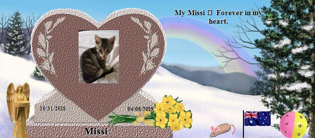 Dear Missi, you are truly cherished. Please go to the Bridge and purr your precious love down the Rainbow straight into the heart of your mum who misses you so much, and she will send her love right back to you on angels' wings. Dear Tracey, your world has lost a very special furpurrson, family member and friend, and heaven has welcomed Home a very special soul. Missi is now your very own angel, watching over and for you, just as Tashi, Katy and BG are watching over us, until you meet again and cross the Bridge together. May her sweet presence continually nuzzle your heart until then, and may you find comfort in knowing that the silver thread of love that binds you heart to heart with your sweet Kitten Angel will never be broken. Many blessings and much peace, Clare and Martha...Please visit our Tashi at http://www.rainbowsbridge.com/residents/TASHI002/resident.HTM