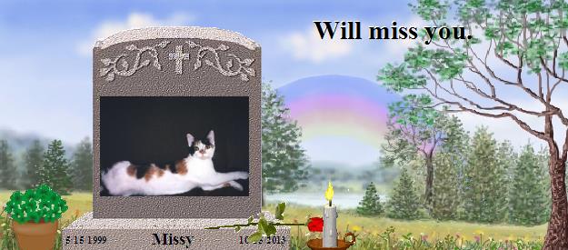 "God gave us our memories so that we might have Roses in December." a quote by J.M. Barrie. May the memories of your blessed furangel, the ones that can't help but bring a smile to your face and a chuckle to your heart as you remember how your baby’s paw prints touched your life, be the ones that bloom in your heart this Holiday Season. My prayer for all of us this blessed season, is that each of our babies wrap up a special little sign for each one of us back here, and send it to us during the Holidays. May you catch a glimpse of your special sign, just when your heart needs it the most....And may each love-filled memory you have of your beloved Missy bring to your heart the very warmth and sunshine of the Rainbow itself. That's just one "gift" your baby-angel would want for you this year...God bless, and best wishes for you and your family this Holiday Season, Karen (Dusty, DJ, Patches, and Momma’s mom) http://RainbowsBridge.com/residents/DUSTY101/Resident.htm