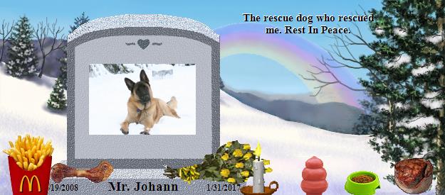 Dear Mr. Johann, you are truly handsome. Please go to the Bridge and send your precious love down the Rainbow straight into the heart of your dad who misses you so much, and he will send his love right back to you on angels' wings. Dear Barclay, your world has lost a very special furperson, family member and friend, and heaven has welcomed Home a very special soul. Mr. Johann is now your very own angel, watching over and for you, just as Tashi, Katy and BG are watching over us, until you meet again and cross the Bridge together. May his sweet love continually nuzzle your heart until then, and may you find comfort in knowing that the silver thread of love that binds you heart to heart with Mr. Johann will never be broken. Many blessings and much peace, Clare and Martha...Please visit our Tashi at http://www.rainbowsbridge.com/residents/TASHI002/resident.HTM