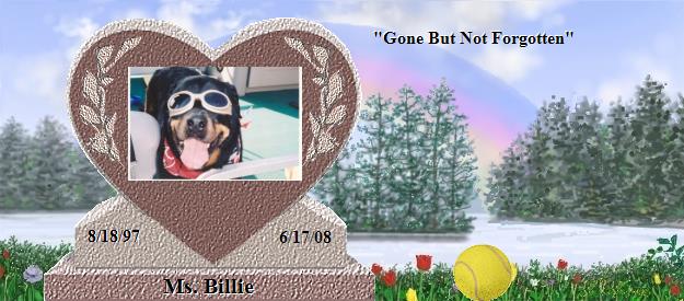 I am so sorry to hear about your recent loss of Ms. Billie. Please find comfort in knowing that Ms. Billie is now at Rainbows Bridge and making lots of friends. Saying goodbye is never easy. I also lost my precious cat Spooky July 30th 2001 after 16 wonderful years with her. I am sure that Ms.Billie and Spooky have become good friends. You can visit with Spooky at: http://www.rainbowsbridge.com/residents/Spook002/resident.HTM Take Care, Susan