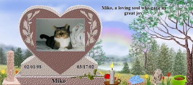 Good morning beautiful Miko I just wanted to stop by your residency to tell you that you and all our furchildren are thought of each day, we will forever hold each of you in our hearts, send your mom a sign to let her know that you are still right there with her just inside her heart. Take care baby.