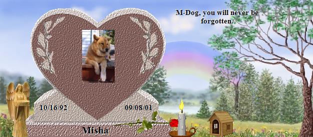 Hello beautiful Misha I was just visiting some of the babies who have been at the bridge for a while and came across you, what a sweet beautiful soul you are. I can tell by your mom and daddy's words that there will always be that "hole" where you were with them, I lost my Princess three years ago this December and there is still that "hole" in my heart too. With time baby we hurt no less but we realize just how blessed we were to have you beautiful ones in our lives. Thank you for giving your family the most precious of gifts the gift of unconditional love, I hope you have made friends with my Princess she was one of my rescues a beautiful baby and I just know you two are running wild in the meadows enjoying perfect health always. Have a beautiful day in heaven today.