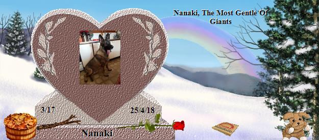 I am so sorry to hear about your loss of Nanaki. Please find comfort in knowing that Nanaki is now at Rainbows Bridge and making lots of friends. Saying goodbye is never easy. I also lost my precious cat Spooky July 30th, 2001, after 16 wonderful years with her. I have lost several babies since Spooky's passing. Hannah 1/11/13, Sammi 8/2/13, Maci 4/9/14, Gabbi 3/20/17, Zoe 1/3/18, Willow 6/4/18, Shelby 6/12/18, Bear 11/17/19, Bella and Murphy who were both tragically poisoned on 06/18/20, Firefly 12/20/22, and Zachary 02/19/23. I am sure that Nanaki and my babies have all become good friends. You can visit with Spooky at: http://www.rainbowsbridge.com/residents/Spook002/resident.HTM Take Care, Susan