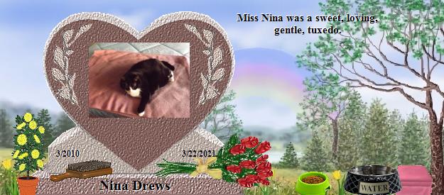 Dear Nina Drews, how purrfectly beautiful you are! Please go to the Bridge and purr your precious love down the Rainbow straight into the heart of your daddy who misses you so much, and he will send his love right back to you on angels' wings. Dear Richard, your world has lost a very special furpurrson, family member and friend, and heaven has welcomed Home a very special soul. Nina is now your very own angel, watching over and for you, just as Jackie, Callie, Tashi, Katy and BG are watching over us, until you meet again and cross the Bridge together. May her sweet presence continually nuzzle your heart until then, and may you find comfort in knowing that the silver thread of love that binds you heart to heart with Miss Nina will never be broken. Many blessings and much peace, Clare and Martha...Please visit our Jackie at https://www.rainbowsbridge.com/residents/JACKI010/resident.HTM