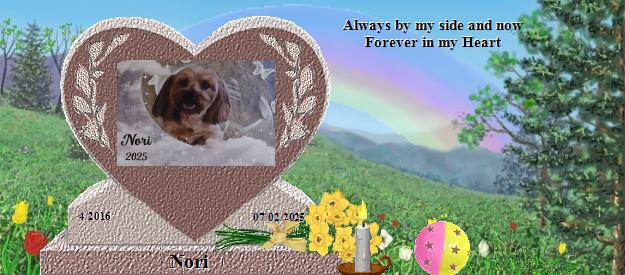 Dear Nori, you are truly beautiful. Please go to the Bridge and send your precious love down the Rainbow straight into the heart of your mom who misses you so much, and she will send her love right back to you on angels' wings. Dear Cindy, your world has lost a very special furperson, family member and friend, and heaven has welcomed Home a very special soul. Nori is now your very own angel, watching over and for you, just as Fritz, Jackie, Callie, Tashi, Katy and BG are watching over me, until you meet again and cross the Bridge together. May her sweet presence continually nuzzle your heart until then, and may you find comfort in knowing that the silver thread of love that binds you heart to heart with Nori will never be broken. Many blessings and much peace, Clare...Please visit my Fritz at https://www.rainbowsbridge.com/residents/FRITZ021/resident.htm