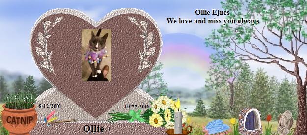 I am so sorry to hear about your loss of Ollie. Please find comfort in knowing that Ollie is now at Rainbows Bridge and making lots of friends. Saying goodbye is never easy. I also lost my precious cat Spooky July 30th 2001 after 16 wonderful years with her. I have lost several babies since Spooky's passing. Hannah 1/11/13, Sammi 8/2/13,Maci 4/9/14, Gabbi 3/20/17, Zoe 1/3/18, Willow 6/4/18, and Shelby 6/12/18. I am sure that Ollie and my babies have all become good friends. You can visit with Spooky at: http://www.rainbowsbridge.com/residents/Spook002/resident.HTM Take Care, Susan