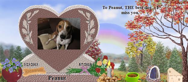 I am so sorry to hear about your loss of Peanut. Please find comfort in knowing that Peanut is now at Rainbows Bridge and making lots of friends. Saying goodbye is never easy. I also lost my precious cat Spooky July 30th 2001 after 16 wonderful years with her. I have lost several babies since Spooky's passing. Hannah 1/11/13, Sammi 8/2/13,Maci 4/9/14, Gabbi 3/20/17, Zoe 1/3/18, Willow 6/4/18, and Shelby 6/12/18. I am sure that Peanut and my babies have all become good friends. You can visit with Spooky at: http://www.rainbowsbridge.com/residents/Spook002/resident.HTM Take Care, Susan
