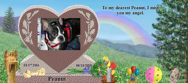 Dear Peanut, you are truly beautiful. Please go to the Bridge and send your precious love down the Rainbow straight into the heart of your mommy who misses you so much, and she will send her love right back to you on angels' wings. Dear Dianne, your world has lost a very special furperson, family member and friend, and heaven has welcomed Home a very special soul. Peanut is now your very own angel, watching over and for you, just as Tashi, Katy and BG are watching over us, until you meet again and cross the Bridge together. May her sweet presence continually nuzzle your heart until then, and may you find comfort in knowing that the silver thread of love that binds you heart to heart with Peanut will never be broken. Many blessings and much peace, Clare and Martha...Please visit our Tashi at http://www.rainbowsbridge.com/residents/TASHI002/resident.HTM