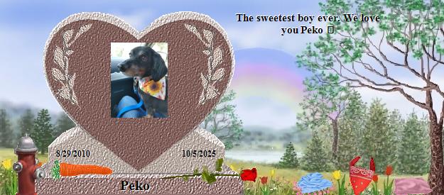 Dear Peko, you are truly handsome. Please go to the Bridge and send your precious love down the Rainbow straight into the hearts of Heather and Ross who miss you so much, and they will send their love right back to you on angels' wings. Dear Heather and Ross, your world has lost a very special furperson, family member and friend, and heaven has welcomed Home a very special soul. Peko, along with Zoey, is now your very own angel, watching over and for you, just as Fritz, Jackie, Callie, Tashi, Katy and BG are watching over me, until you meet again and cross the Bridge together. May their sweet presence continually nuzzle your hearts until then, and may you find comfort in knowing that the silver thread of love that binds you heart to heart with Peko and Zoey will never be broken. Many blessings and much peace, Clare...Please visit my Fritz at https://www.rainbowsbridge.com/residents/FRITZ021/resident.htm