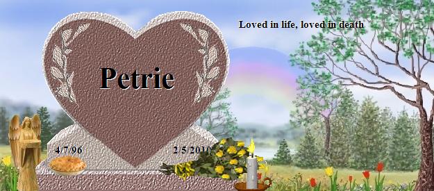 Petrie, What a precious baby you were, always so loyal and loving.You taught and gave your family so much that they now know the true meaning of unconditional love.They long for the day to be able to hold you and to look into your eyes again. I know just how grateful you are for all of love and care in which they provided you. They miss you baby, so very much. I know that you don't want them to be sad for too long, but instead, be happy. For you are happy, content at peace and have been surrounded by so many others who also love and adore you, including my Shayna Girl and Leche.I extend my deepest condolences to you for the loss of Petrie.I know just how painful it is to have lost your angel, for, I too, lost mine. Please vist my Shayna Girl at: http://rainbowsbridge.com/residents/SHAYN005/Resident.htm and Leche at http://www.rainbowbridge.com/residents/LECHE001/Resident.htm My thoughts and prayers are with you. Until we are with our babies again. Shayna and Leche's mommy, Lisa