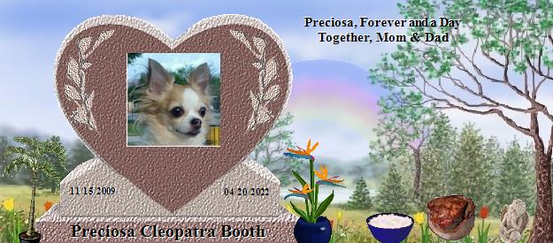 Dear Preciosa Cleopatra Booth, you are truly beautiful. Please go to the Bridge and send your precious love down the Rainbow straight into the hearts of your mom and dad who miss you so much, and they will send their love right back to you on angels' wings. Dear Alicia and Bob, your world has lost a very special furperson, family member and friend, and heaven has welcomed Home a very special soul. Preciosa is now your very own angel, watching over and for you, just as Jackie, Callie, Tashi, Katy and BG are watching over us, until you meet again and cross the Bridge together. May her sweet presence continually nuzzle your hearts until then, and may you find comfort in knowing that the silver thread of love that binds you heart to heart with Preciosa will never be broken. Many blessings and much peace, Clare and Martha...Please visit our Jackie at https://www.rainbowsbridge.com/residents/JACKI010/resident.HTM