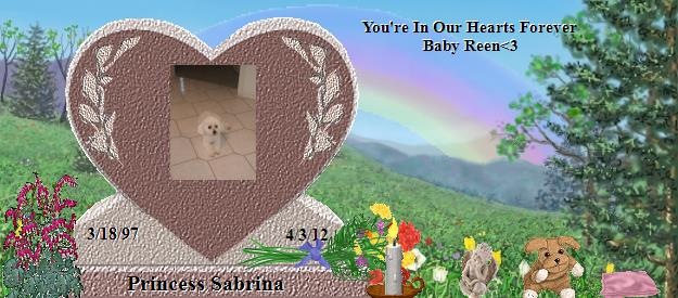 Dear Rick and Lindsay, she's beautiful and precious in every way. What a wonderful blessing that she was with you for many years, bringing love and happiness to you every day. How well I know the same blessing. My boy kitty, Bubba Lou, was also born in 1997 but left for heaven's most beautiful meadow last year. We must always know that our babies have gone to a happy place where they are young and well again. Sweet Princess Sabrina now plays like a puppy in heavenly sunshine. She roams, chases, cuddles and naps, knowing all along that she will be reunited with her earthly family someday. To us, it will seem like an eternity until we see our little angels again, but to them, it's the blink of an eye and the little wag of a precious little tail! I wish you blessings of healing and peace, dear friends. You were, and always will be, a wonderful family for Princess Sabrina. I understand and care. Jane
