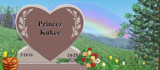 I am so sorry for your loss of Princez Kukee. My heart goes out to you as I know you are struggling so with the loss of your precious baby. Your world has lost a very special baby, family member and friend, but the heavens have welcomed home a very special soul. I know you had a special relationship with Princez Kukee that will always be a part of you. I pray that my sweet little girl, Bailey, found Princez Kukee and they’ve become friends. May the love you shared with Princez Kukee continue to warm your heart and I hope you find peace and comfort knowing that your love will bind you together forever. My precious Bailey left our world December 5th, 2013 and we miss her so. Please visit my Bailey at http://RainbowsBridge.com/residents/BAILE364/Resident.htm
