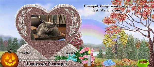 Dear Professor Crumpet, how purrfectly handsome you are! Please go to the Bridge and purr your precious love down the Rainbow straight into the hearts of your mom and dad who miss you so much, and they will send their love right back to you on angels' wings. Dear Tara and Pete, your world has lost a very special furpurrson, family member and friend, and heaven has welcomed Home a very special soul. Crumpet is now your very own angel, watching over and for you, just as Fritz, Jackie, Callie, Tashi, Katy and BG are watching over me, until you meet again and cross the Bridge together. May his sweet presence continually nuzzle your hearts until then, and may you find comfort in knowing that the silver thread of love that binds you heart to heart with Professor Crumpet will never be broken. Many blessings and much peace, Clare...Please visit my Fritz at https://www.rainbowsbridge.com/residents/FRITZ021/resident.htm