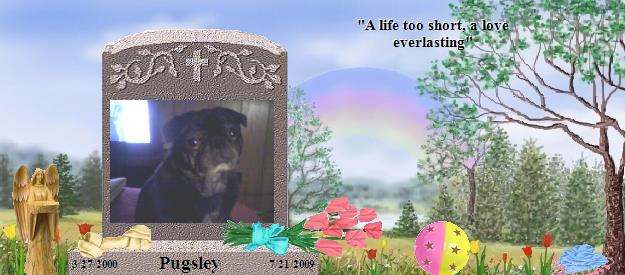 My Dearest Pugsley It has been three very long years since our lovely Pugsley went to Heaven. There is not a day that goes by that we do not think of you and what a special little fellow you were and still is to us. Have wonderful time playing, having all the treats you want and that mommy and daddy love you and miss you. Love and Kisses Always Mommy and Daddy
