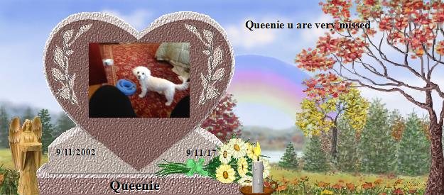 Dear Queenie, you are truly beautiful. Please go to the Bridge and send your precious love down the Rainbow straight into the heart of your mommy who misses you so much, and she will send her love right back to you on angels' wings. Dear Alison, your world has lost a very special furperson, family member and friend, and heaven has welcomed Home a very special soul. Queenie is now your very own angel, watching over and for you, just as Callie, Tashi, Katy and BG are watching over us, until you meet again and cross the Bridge together. May her sweet presence continually nuzzle your heart until then, and may you find comfort in knowing that the silver thread of love that binds you heart to heart with Queenie will never be broken. Many blessings and much peace, Clare and Martha...Please visit our Callie at http://www.rainbowsbridge.com/residents/CALLI052/resident.HTM