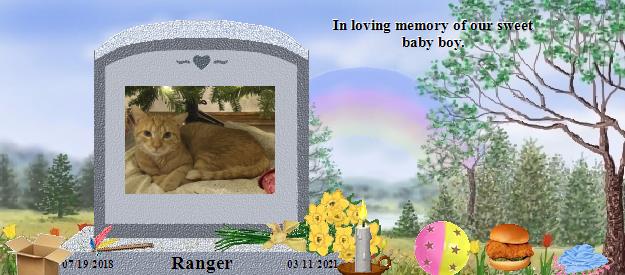 Dear Ranger, how purrfectly handsome you are! Please go to the Bridge and purr your precious love down the Rainbow straight into the hearts of your family who miss you so much, and they will send their love right back to you on angels' wings. Dear Olya, Nika, Ira & Vova, your world has lost a very special furpurrson, family member and friend, and heaven has welcomed Home a very special soul. Ranger is now your very own angel, watching over and for you, just as Jackie, Callie, Tashi, Katy & BG are watching over us, until you meet again and cross the Bridge together. May his sweet presence continually nuzzle your hearts until then, and may you find comfort in knowing that the silver thread of love that binds you heart to heart with Ranger will never be broken. Many blessings & much peace, Clare & Martha...Please visit our Jackie at https://www.rainbowsbridge.com/residents/JACKI010/resident.HTM