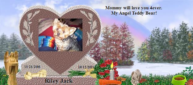 Dear Lizzie, You have set up a beautiful little place for precious Riley Jack. The story you wrote of the love you two shared is just so sweet. Our babies will forever be ours...and we will hold them in our arms again. All my love to precious Riley Jack and my Sadie girl. God bless you, Nikki htt://rainbowbridge.com/residents/sadie291/residents.htm