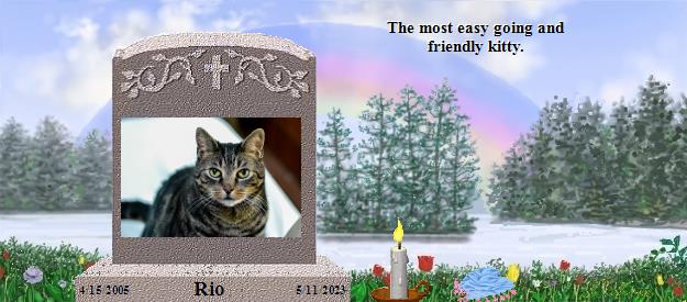 I am so sorry to hear about your loss of Rio. Please find comfort in knowing that Rio is now at Rainbows Bridge and making lots of friends. Saying goodbye is never easy. I also lost my precious cat Spooky July 30th, 2001, after 16 wonderful years with her. I have lost several babies since Spooky's passing. Hannah 1/11/13, Sammi 8/2/13, Maci 4/9/14, Gabbi 3/20/17, Zoe 1/3/18, Willow 6/4/18, Shelby 6/12/18, Bear 11/17/19, Bella and Murphy who were both tragically poisoned on 06/18/20, Firefly 12/20/22, and Zachary 02/19/23. I am sure that Rio and my babies have all become good friends. You can visit with Spooky at: http://www.rainbowsbridge.com/residents/Spook002/resident.HTM Take Care, Susan