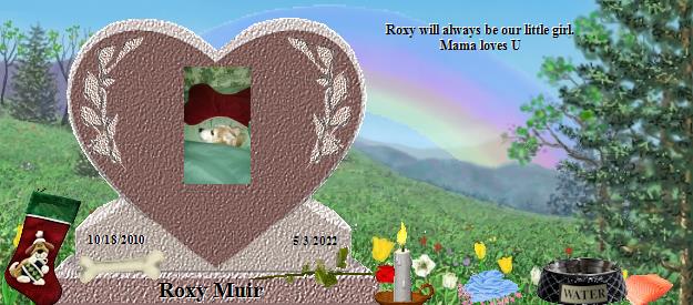 Dear Roxy Muir, you are truly beautiful. Please go to the Bridge and send your precious love down the Rainbow straight into the hearts of your family who miss you so much, and they will send their love right back to you on angels' wings. Dear Bob and Sheri, your world has lost a very special furperson, family member and friend, and heaven has welcomed Home a very special soul. Roxy is now your very own angel, watching over and for you, just as Jackie, Callie, Tashi, Katy and BG are watching over us, until you meet again and cross the Bridge together. May her sweet presence continually nuzzle your hearts until then, and may you find comfort in knowing that the silver thread of love that binds you heart to heart with Roxy will never be broken. Many blessings and much peace, Clare and Martha...Please visit our Jackie at https://www.rainbowsbridge.com/residents/JACKI010/resident.HTM