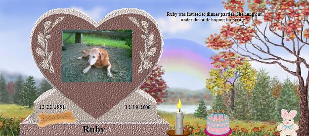 Good Morning Ruby, and what a pretty girl you are. My special guy Cy will be right there to welcome you with open paws. This is a magical night at the bridge, at 11:45, all the pets gather at the rim of the rainbow, and look down at their people and former homes. THen at midnight all in unison whisper ":Ilove you". And you know what, all of us hear you. So now you have a very special job at the bridge, and thatis to be the guardian angel for your mom and dad. Smile down on them from the rainbow, ad they will know it is you. But for now, run fast, play hard, and love always. Cheryl aka Cyrano's mom