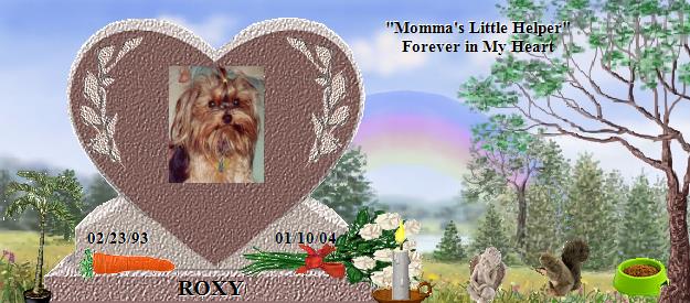 Hello precious little Roxy-My furbaby caleb and i say hello-we have met your Pebbles and Thumbellina, and my-what a beautiful little group of girls you are. The apples of your mommys' eyes. She wrote beautiful stories for all of you.Just think-your mommy Joanne has her very own little group of stars in the Heavens, and how they shine with all of your spirit of eternal love. That beautiful glow will draw your mommys' eyes to your special place and she will know it is her babies sending her their shining love. Send her many little kisses on the silvery moonbeams to brush against her face-always take time to send her that love-and whisper in her dreams how you brought so much of her with you, you will never be lonely. Play safely together, and rest well little one. say hi to my caleb, and give him a hug and kiss from his daddy.