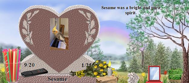 For sweet Sesame, I know that during your lifetime you gave Holly much joy. Now I am wishing you lots and lots of happiness flying over the meadows beyond the Rainbow Bridge. From looking at your photo and reading what Holly wrote for and about you it is obvious that you came from a very warm and loving home. Holly, I just visited your Sesame's Rainbows Bridge residency and wanted to express my deepest sympathy for the loss of your precious Feathered Angel. I am sure if asked, Sesame would have said that every day spent with you was a blessing. Having lost my little dogs Pedro and Keshet I can understand how you must be feeling and how much you must miss Sesame. Wishing you all the very best always, Rosalind (Pedro and Keshet's Mom).