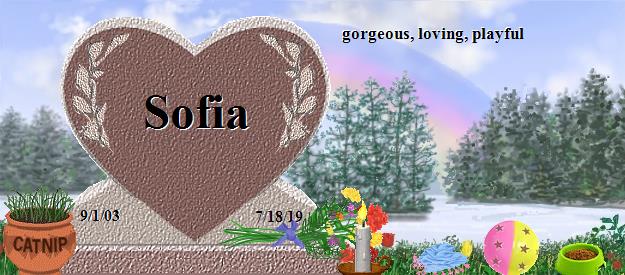I am so sorry to hear about your loss of Sofia. Please find comfort in knowing that Sofia is now at Rainbows Bridge and making lots of friends. Saying goodbye is never easy. I also lost my precious cat Spooky July 30th 2001 after 16 wonderful years with her. I have lost several babies since Spooky's passing. Hannah 1/11/13, Sammi 8/2/13,Maci 4/9/14, Gabbi 3/20/17, Zoe 1/3/18, Willow 6/4/18, and Shelby 6/12/18. I am sure that Sofia and my babies have all become good friends. You can visit with Spooky at: http://www.rainbowsbridge.com/residents/Spook002/resident.HTM Take Care, Susan