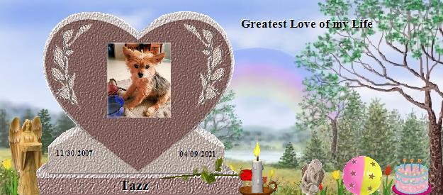 I am so sorry to hear about your loss of Tazz. Please find comfort in knowing that Tazz is now at Rainbows Bridge and making lots of friends. Saying goodbye is never easy. I also lost my precious cat Spooky July 30th 2001 after 16 wonderful years with her. I have lost several babies since Spooky's passing. Hannah 1/11/13, Sammi 8/2/13,Maci 4/9/14, Gabbi 3/20/17, Zoe 1/3/18, Willow 6/4/18, Shelby 6/12/18, Bear 11/17/19 and Bella and Murphy who were both tragically poisoned on 06/18/20. I am sure that Tazz and my babies have all become good friends. You can visit with Spooky at: http://www.rainbowsbridge.com/residents/Spook002/resident.HTM Take Care, Susan