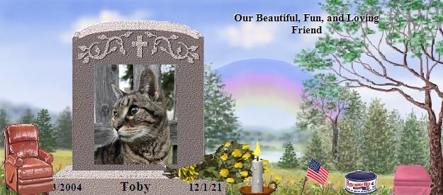 Dear Toby, how purrfectly handsome you are! Please go to the Bridge and purr your precious love down the Rainbow straight into the hearts of your family who miss you so much, and they will send their love right back to you on angels' wings. Dear Gigi, your world has lost a very special furpurrsons, family member and friend, and heaven has welcomed Home a very special soul. Toby is now your very own angel, watching over and for you, just as Jackie, Callie, Tashi, Katy and BG are watching over us, until you meet again and cross the Bridge together. May his sweet presence continually nuzzle your heart until then, and may you find comfort in knowing that the silver thread of love that binds you heart to heart with Toby will never be broken. Many blessings and much peace, Clare and Martha...Please visit our Jackie at https://www.rainbowsbridge.com/residents/JACKI010/resident.HTM