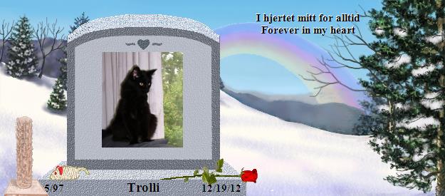 Dear Trolli, you are purrfectly gorgeous! Please go to the Bridge and purr your precious love down the Rainbow straight into the heart of your mommy who misses you so much, and she will send her love right back to you on angels' wings. Janne, your world has lost a very special furpurrson, family member and friend, and heaven has welcomed home a very special soul. Trolli is now your very own angel, watching over and for you, just as Tashi, Katy and BG are watching over us, until you meet again and cross the Bridge together. May her sweet love continually nuzzle your heart until then, and may you find comfort in knowing that the silver thread of love that binds you heart to heart with Trolli will never be broken. Blessings and peace, Clare and Martha...Please visit our Tashi at http://www.rainbowsbridge.com/residents/TASHI002/resident.HTM
