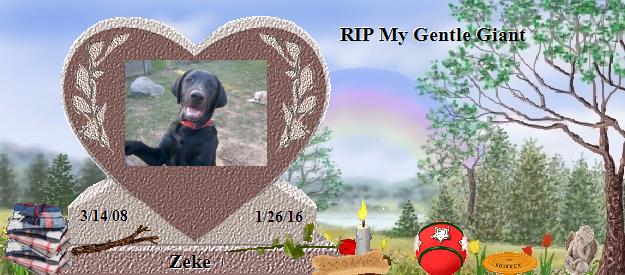 I am so sorry to hear about your loss of Zeke. Please find comfort in knowing that Zeke is now at Rainbows Bridge and making lots of friends. Saying goodbye is never easy. I also lost my precious cat Spooky July 30th 2001 after 16 wonderful years with her. On January 11, 2013, I lost my faithful friend Hannah who was a beautiful blue tick hound dog. On August 2, 2013 another one of my beautiful cats, Sammi, a black and white tabby, went to Rainbows Bridge. April 9, 2014, Maci, my English Bulldog passed over to Rainbows Bridge. Maci and Hannah were best friends. I am sure that Zeke and my babies have all become good friends. You can visit with Spooky at: http://www.rainbowsbridge.com/residents/Spook002/resident.HTM Take Care, Susan